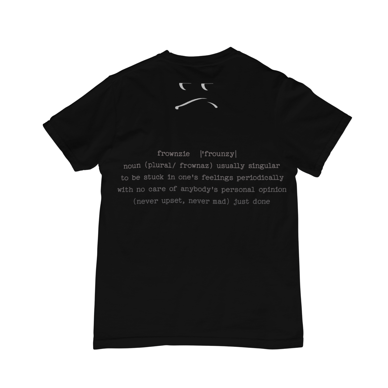 The Frownzie 2 Die 4 tee features a striking monochromatic design highlighted by distressed textures and typography with a dynamic angel illustration. The bottom left of the Tee shows when the brand was established with a matching FRNZ logo. On the back of the tee is the definition of Frownzie making the design a true statement piece.