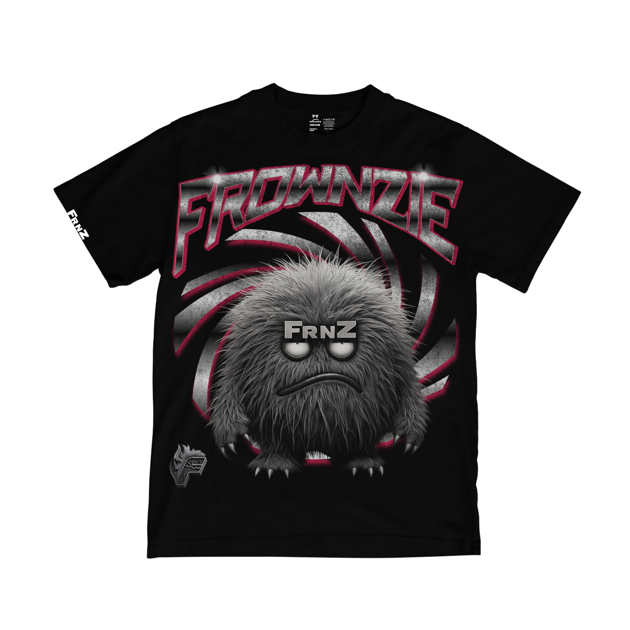 The Frownzie Skud tee features a bold design with “FROWNZIE” in sharp, metallic-inspired lettering across the chest. Centered below is our mascot, Mr.Frownzie but his friends call him Skud, furry and all. A dynamic spiral adds motion and edge behind him. A smaller FrnZ logo detail is printed on the sleeve, enhancing the aesthetic.