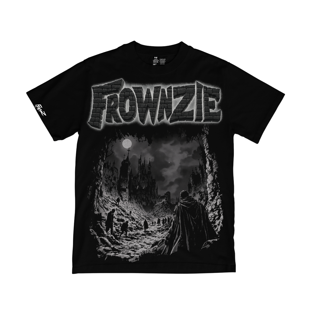 This tee channels a medieval feeling with a mystical graphic of cloaked figures walking from a dark castle under a full moon. The bold Frownzie logo crowns the design in cracked stone lettering, amplifying the ominous, cinematic mood. Built for those who thrive through treacherous times.