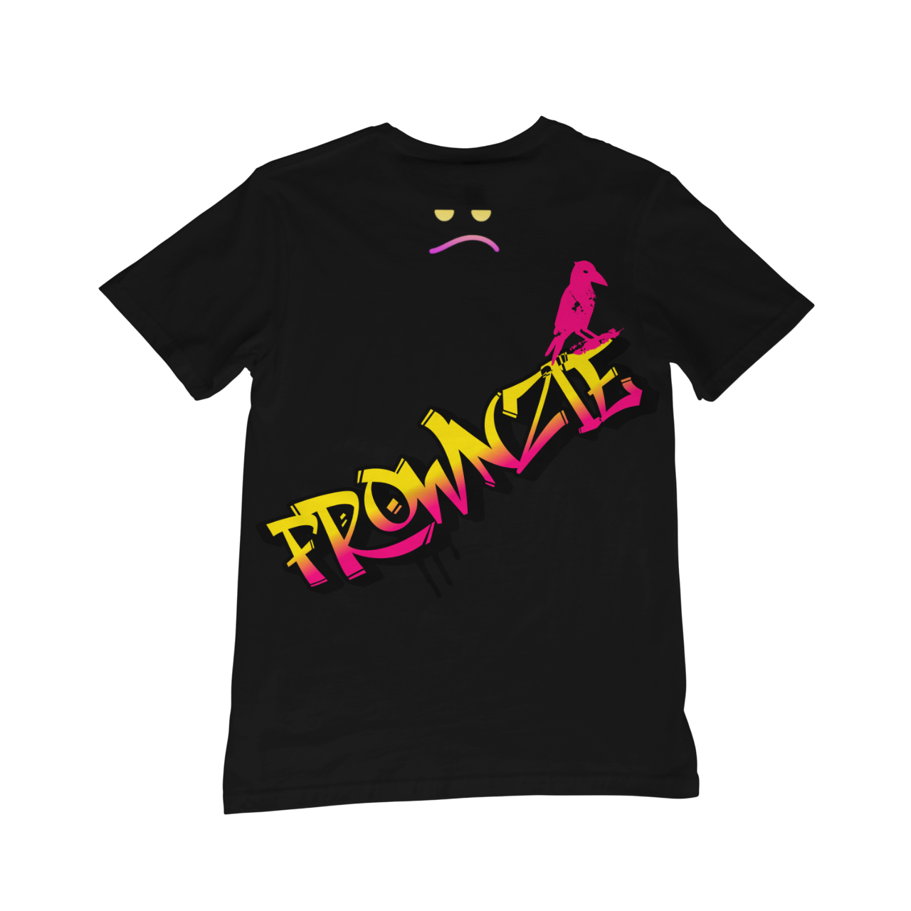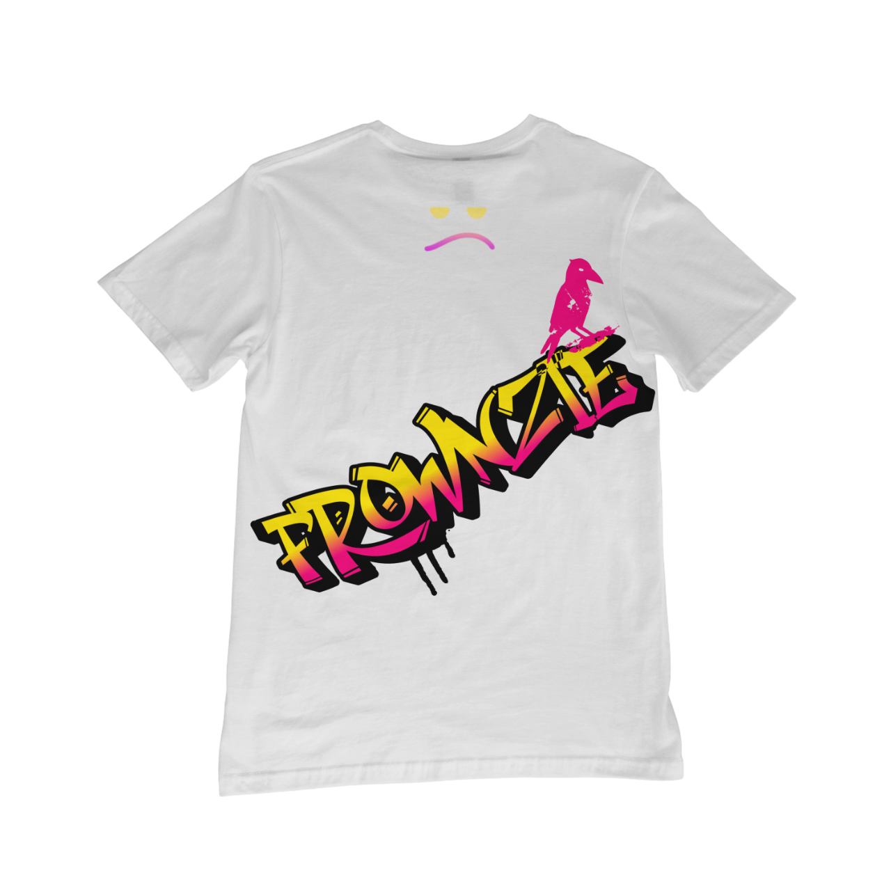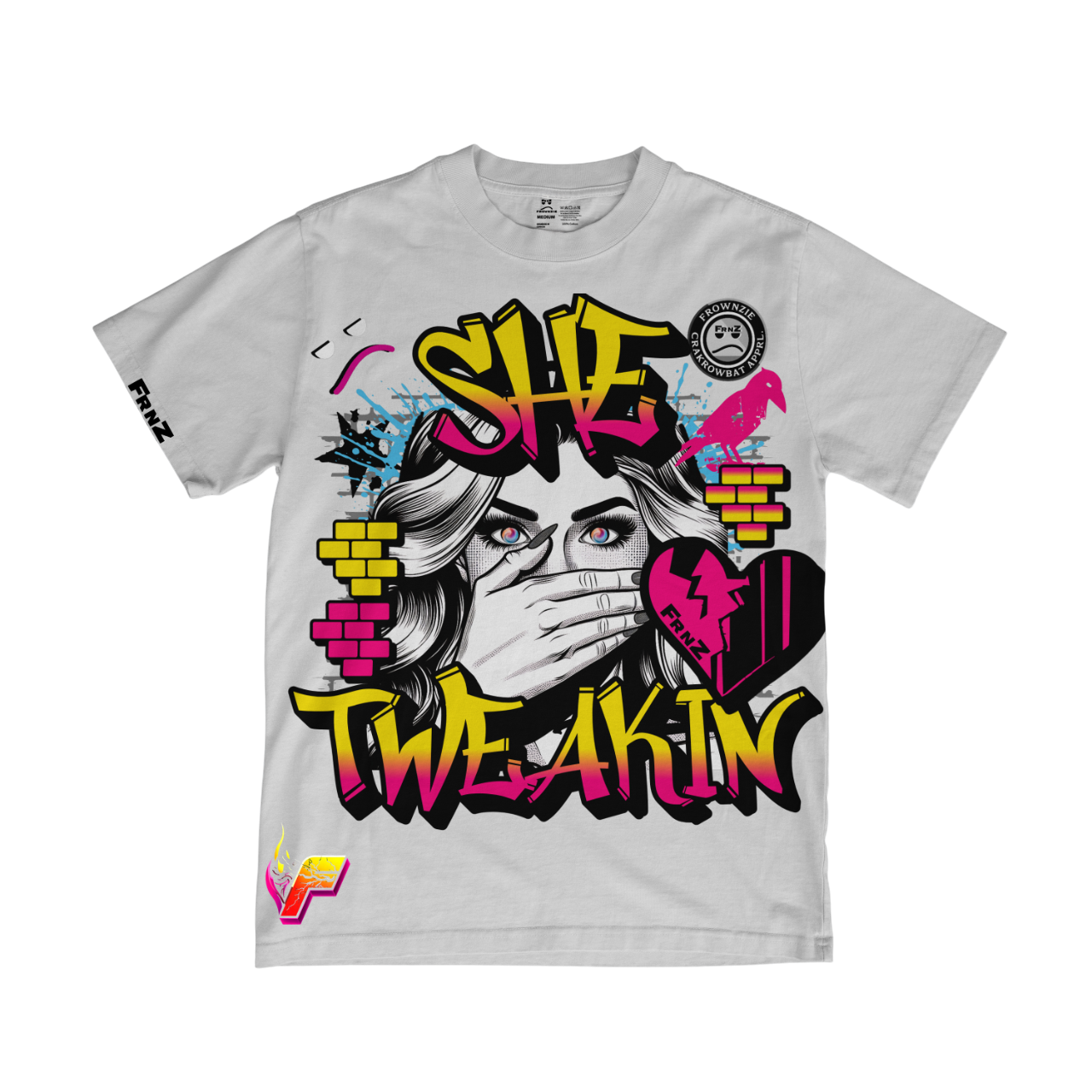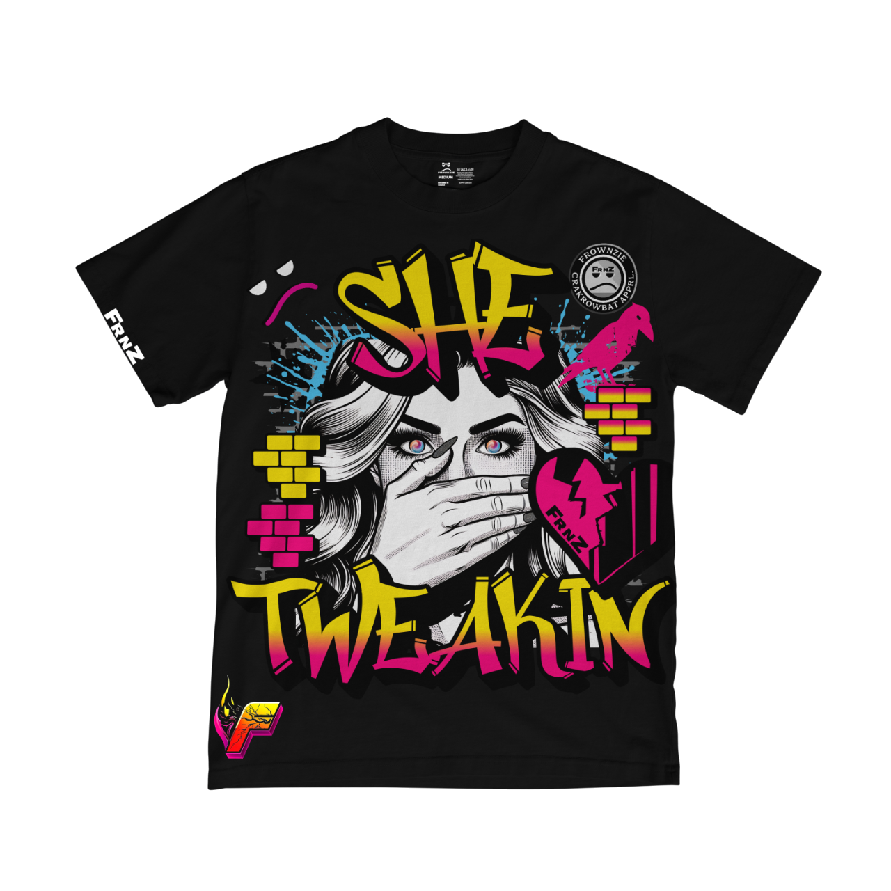 The She Tweakin tee has a Graffiti-style design over a grayscale femme expression with Frownzie graphics and visual glitches. On the back is an oversized Frownzie wordmark in gradient chrome-pink + yellow with a perched bird, and FROWNZIE face logo to seal