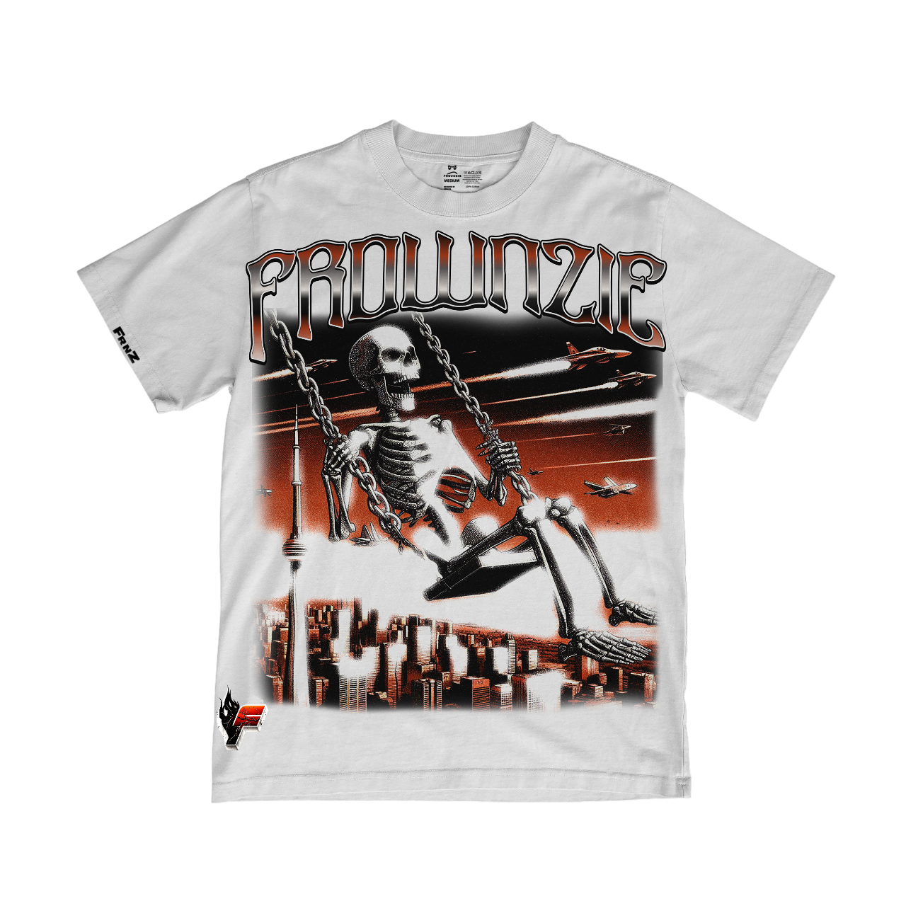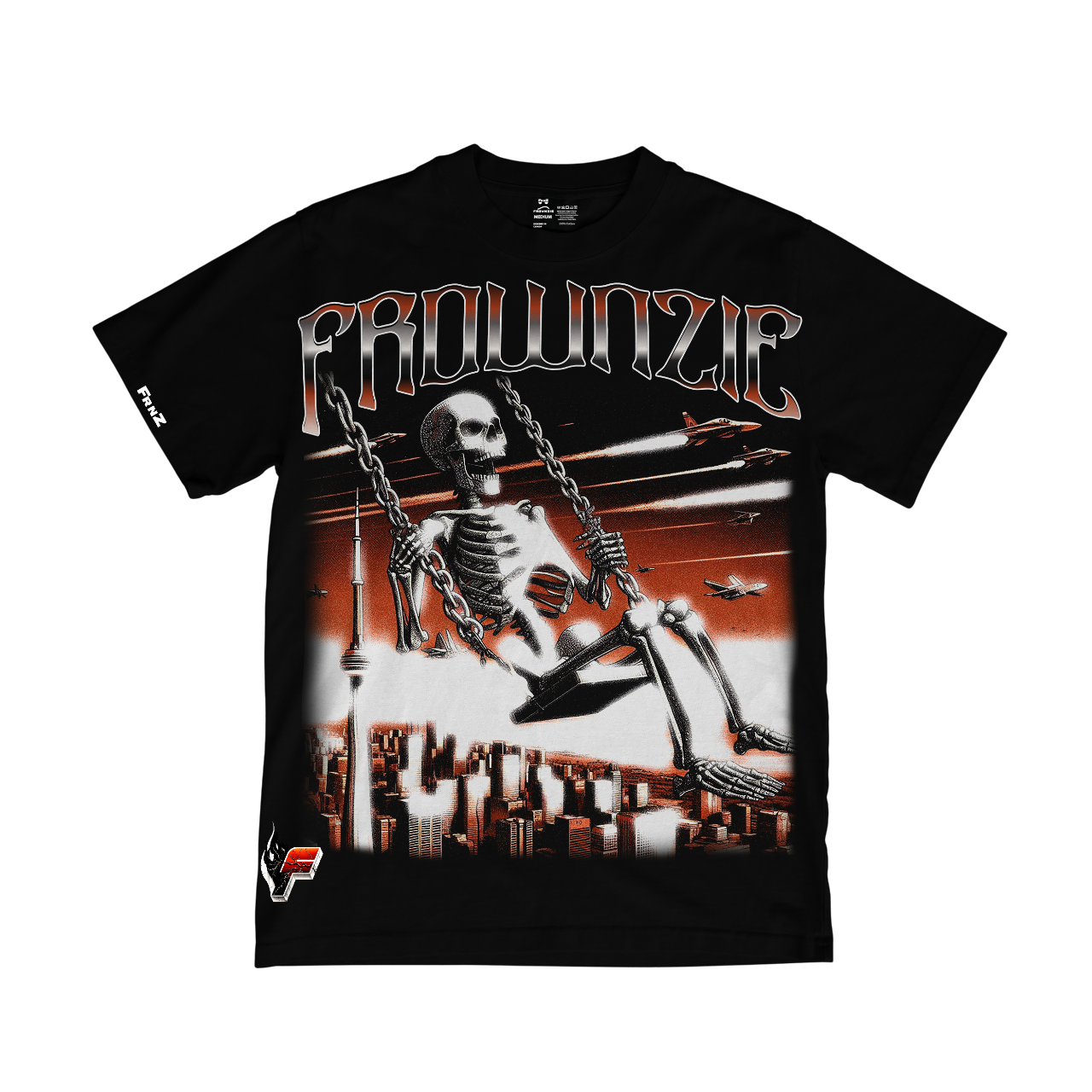 The Frownzie Swinging Peak tee showcases a dramatic scene of a skeleton swinging high above a Toronto city skyline, with fighter jets streaking across the sky under a fiery orange backdrop. The bold “FROWNZIE” logo crowns the design, giving the shirt a rebellious yet freedom-filled energy that stands out.